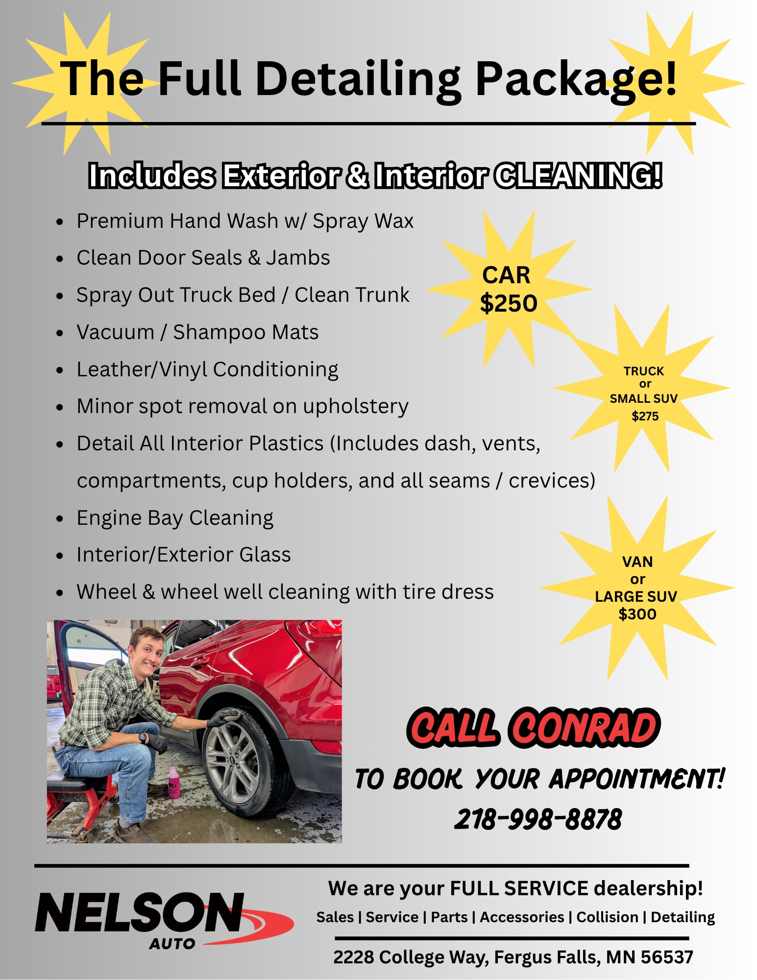 Ready to transform your vehicle? Don't wait! Call Conrad (218) 998-8878 to book your full detailing package appointment. Our detailing department at Nelson Auto is standing by to serve the Fergus Falls community.